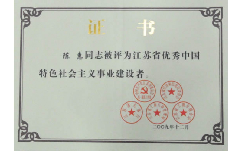 2009年12月,陳惠董事長榮獲江蘇省第四屆“優(yōu)秀中國特色社會主義事業(yè)建設(shè)者”稱號。